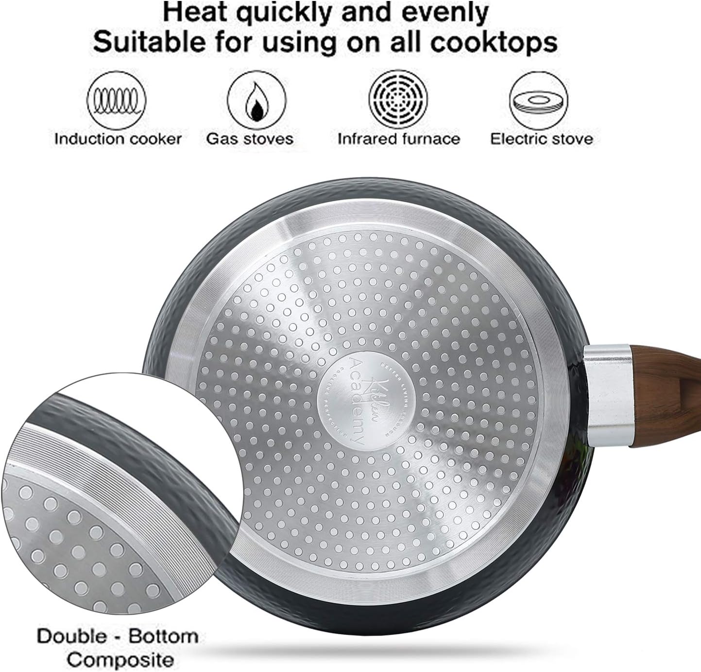 Induction Cookware Sets - When it comes to the interior, this cookware uses an aluminum core. The result is that the pan heats up quickly, and more importantly, distributes heat evenly. The cookware set works on all major types of cooktops, even induction. Sear meat, braise, or even use it as a wok for frying rice