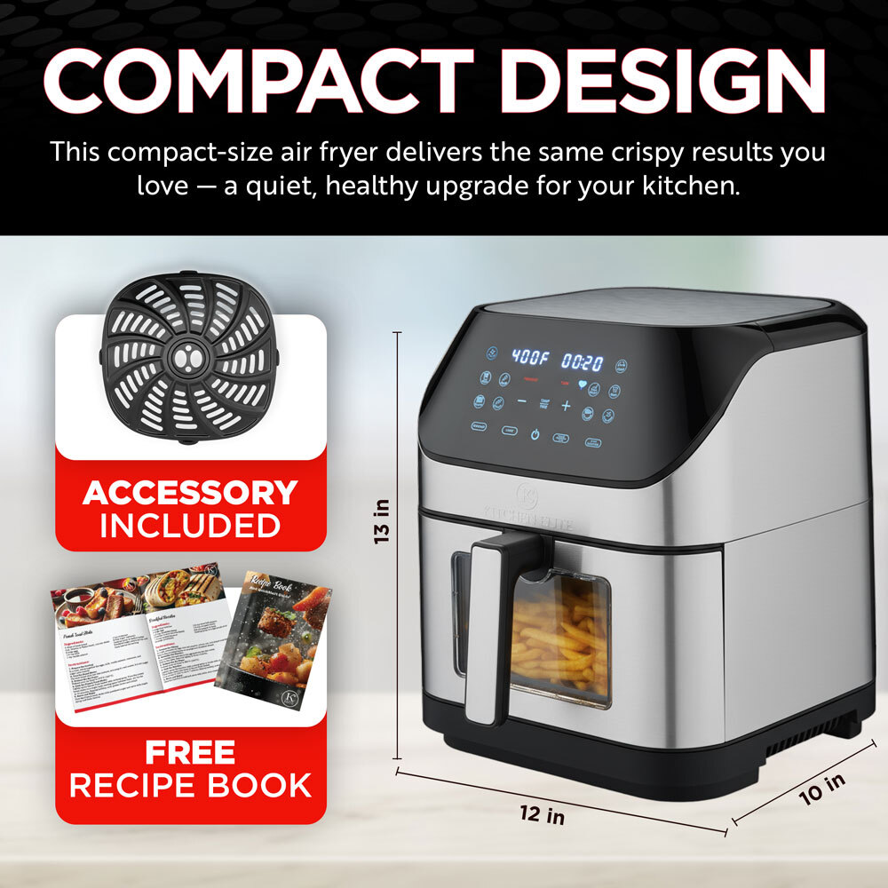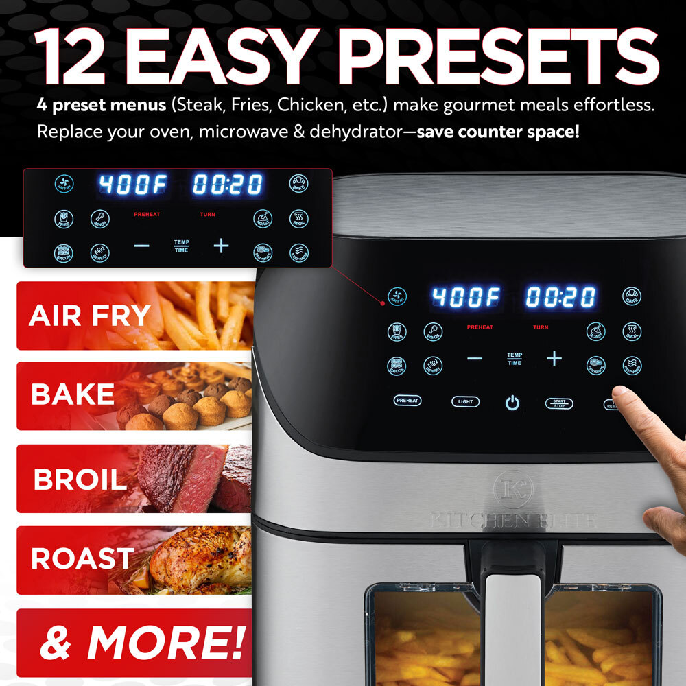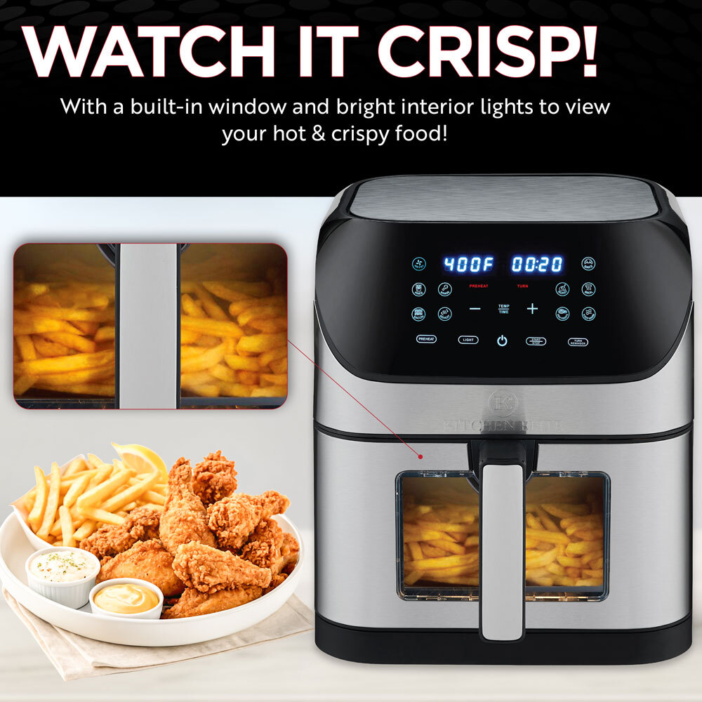 Discover the Kitchen Elite 8QT Stainless Steel Air Fryer: See your food cook, 8 presets. Experience culinary perfection! With its unique window design, witness your food transform into crispy perfection. The sleek stainless steel adds elegance to your kitchen. The 8-quart capacity is perfect for family meals or gatherings. Prepare fries, wings, veggies, and desserts with less oil. Enjoy the convenience of 8 preset functions for consistent results. Watch your food cook through the transparent window. Safety features and easy cleanup make it a must-have. Elevate your meals with the Kitchen Elite air fryer today!